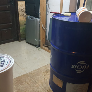 בינתיים יש את החבית לסדר. החבית היא מקרן החום של התנור. היא מאפשרת את הרגשת ה"קמין" בנוסף לקיבול החום של המסה התרמית (ספסל בטון+בוץ). היא מנקזת את האויר הלוהט מתא הבערה ומוליכה אותו לספסל תוך שהיא מוציאה חלק מהחום לחלל החדר. את החבית (שתיים, האמת) שאיכסנה בעבר שמן קיבלתי מחבר העובד בתעשית המכונות. את החבית צריך לנקות מהצבע המקורי (עבה במיוחד) ולצבוע בצבע עמיד בחום. אני החלטתי לא לשרוף את הצבע כמו שרואים במדריכים השונים בנושא אלא לנסות חומר מסיר צבע. כישלון מספר שלוש - חבית עגולה ממש קשה לגרד בשפכטל. בטח לא תו"כ שאיפת חומר ממיס צבע. איום ונורא - נשברתי בשליש הראשון של החבית . יש מי שהציע ברשת לנסות התזת חול באחד ממוסכי הפחחות אבל אני לא רציתי להסתמך על אחרים ולכן העדפתי לנצל זמן נסיעות למוסך לזמן עבודה. במסגרת המלחמה בצבע החבית הכנתי גם מתז חול ביתי (בקבוק קולה עם חול שבפקק הבקבוק עובר צינורית מחוררת של אקדח אויר שמחובר לקומפרסור. הניסוי הצליח לא רע והאקדח ניקה יפה חלודה מפלאייר ישן אבל השטח שכיסה היה מאוד קטן ומהר הבנתי שזה לא הכיוון לחבית הגדולה. עברתי למלטשת הדיסק שלי. שעה וחצי עבודה ונגמר.