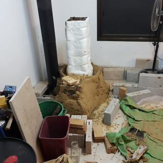 בעזרת הילדים פינינו פינה בסלון ה"עומד להיות מוחרב" שלנו וניתקנו את הקמין. כמות האפר שיצאה מהארובה (ושהמכיכה לצאת במשך כל הפרוייקט) היתה עצומה. דוגמה אפשר לראות על הרצפה מאחרי התנור מיד לאחר הניתוק מהארובה.
